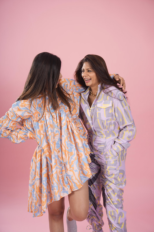 Gathered pink with yellow alphabet print jumpsuit with long sleeves and gathers front zip opening. Runway ready