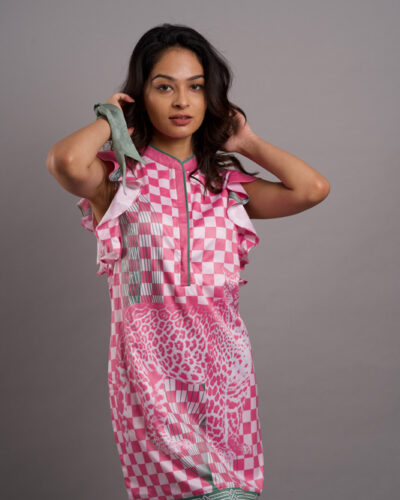 Elevate your wardrobe with this stylish shirt featuring a high round neck and a crumpled detail on the shoulder.